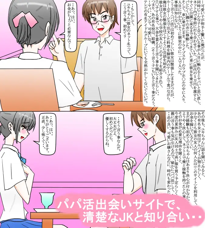 このページでは、未成年者閲覧禁止の同人作品、『円光清純JKとパパ活初体験』を紹介しています。ネタバレ注意。