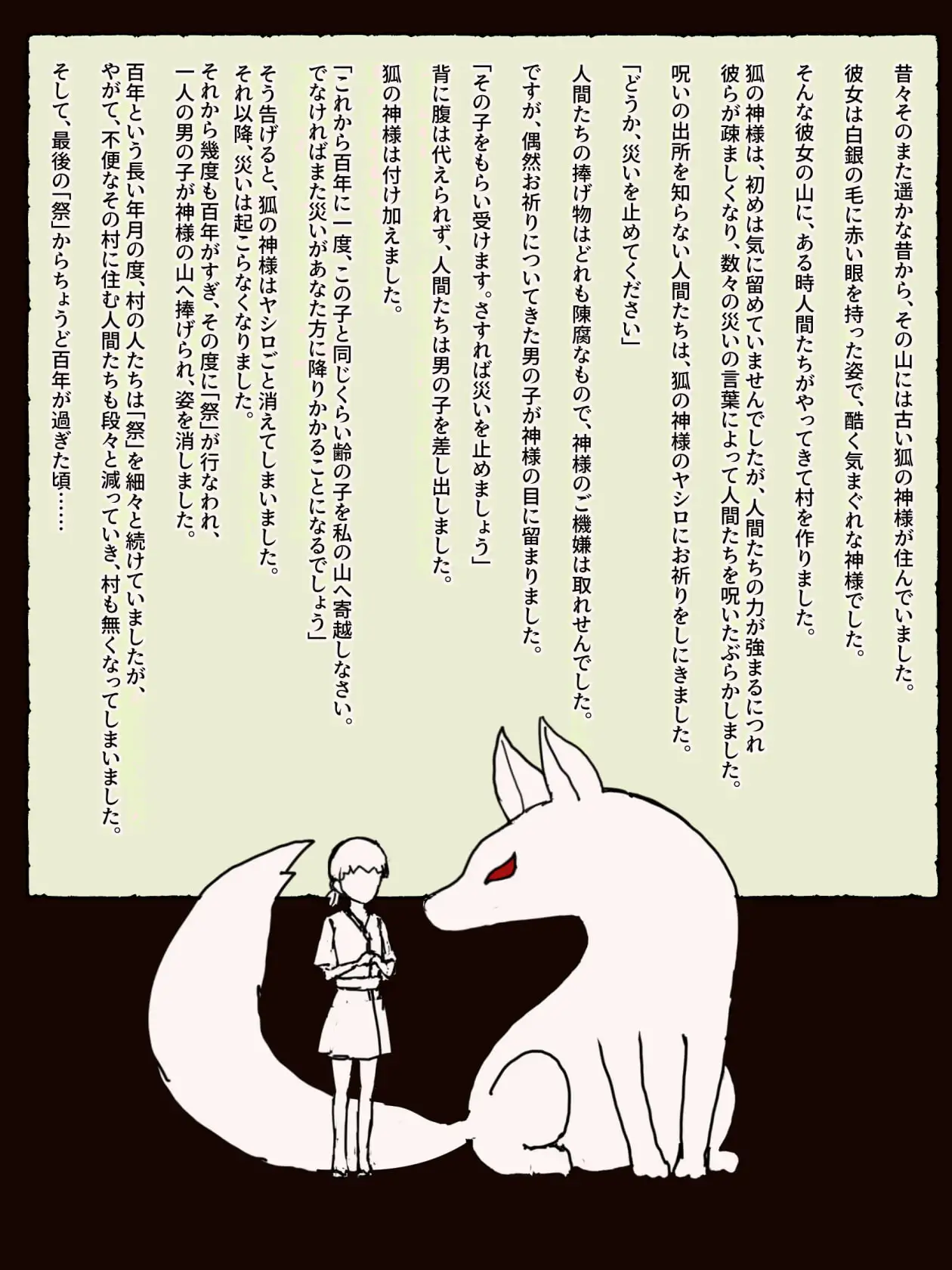 このページでは、未成年者閲覧禁止の同人作品、『狐神に見初められた少年の話』を紹介しています。ネタバレ注意。
