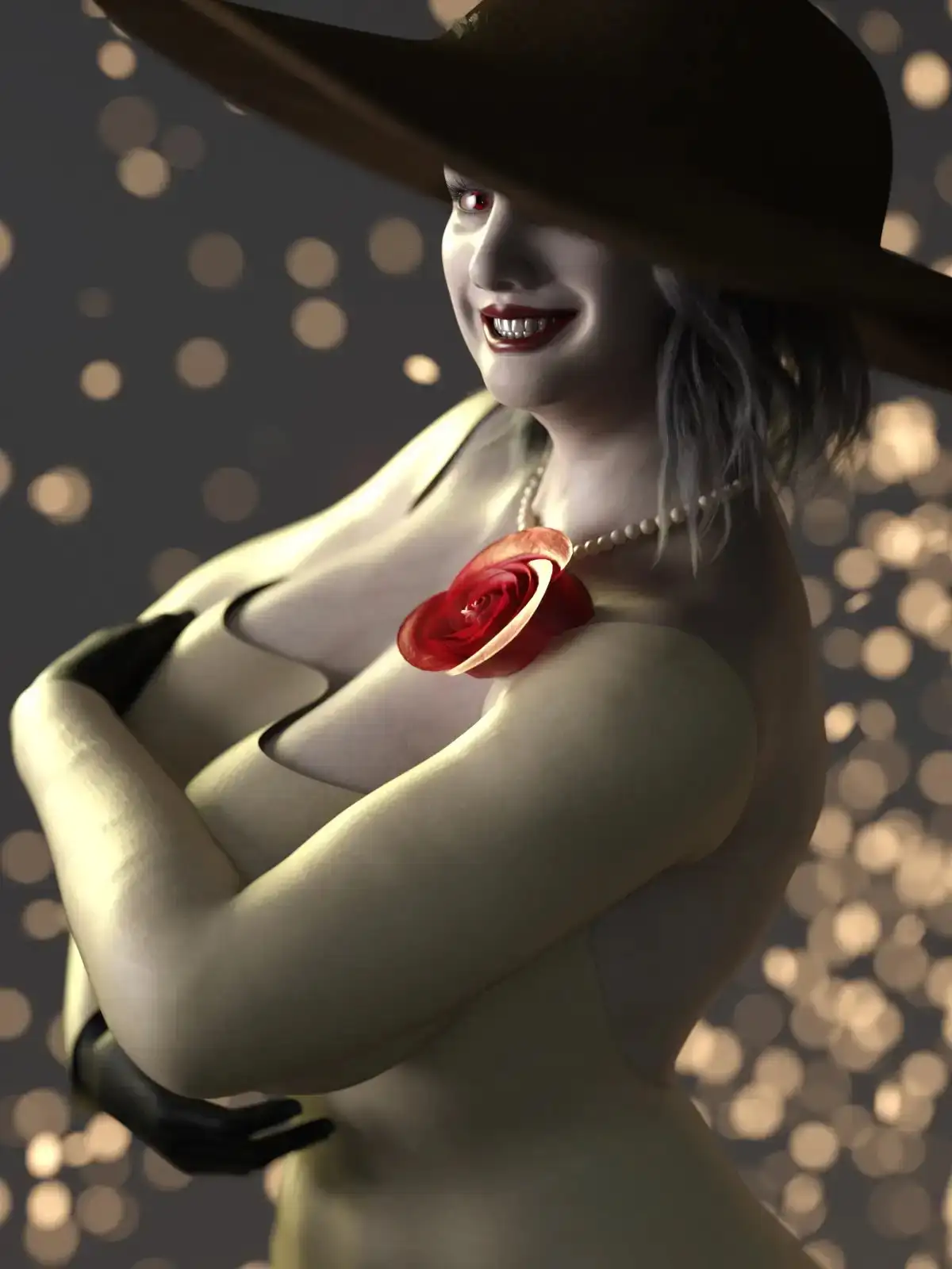 お城に住んでいる長身女性のヴァンパイア夫人をイメージした画像集です。成長し過ぎてしまった奥様は高い身長と爆乳にデカ尻で非常にムチムチな体をしています。白のロングドレスやその下に隠された白の下着やガーターベルト、網タイツそして赤いハイヒールなどの衣装があります。