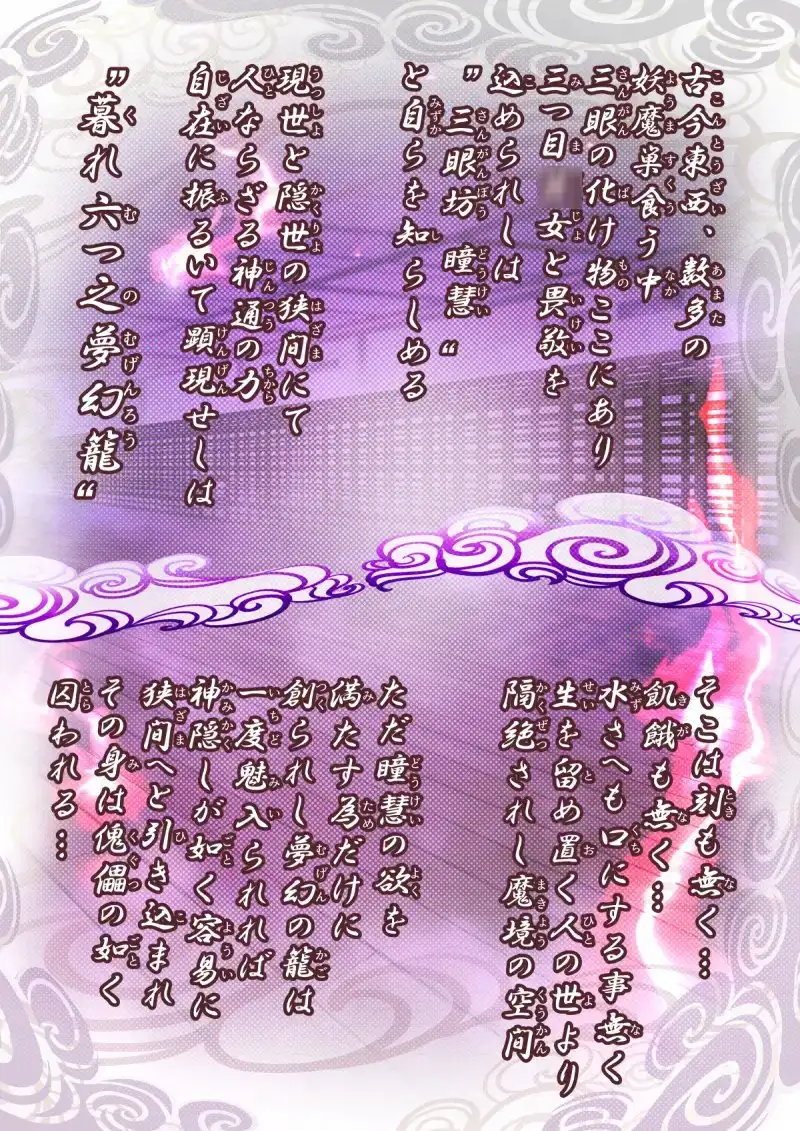 三つ目の異形「三眼坊 瞳慧(さんがんぼう どうけい)」と名乗る妖が、自らの神通力で作り出した異空間「暮れ六つ夢幻籠(くれむつのむげんろう)」。