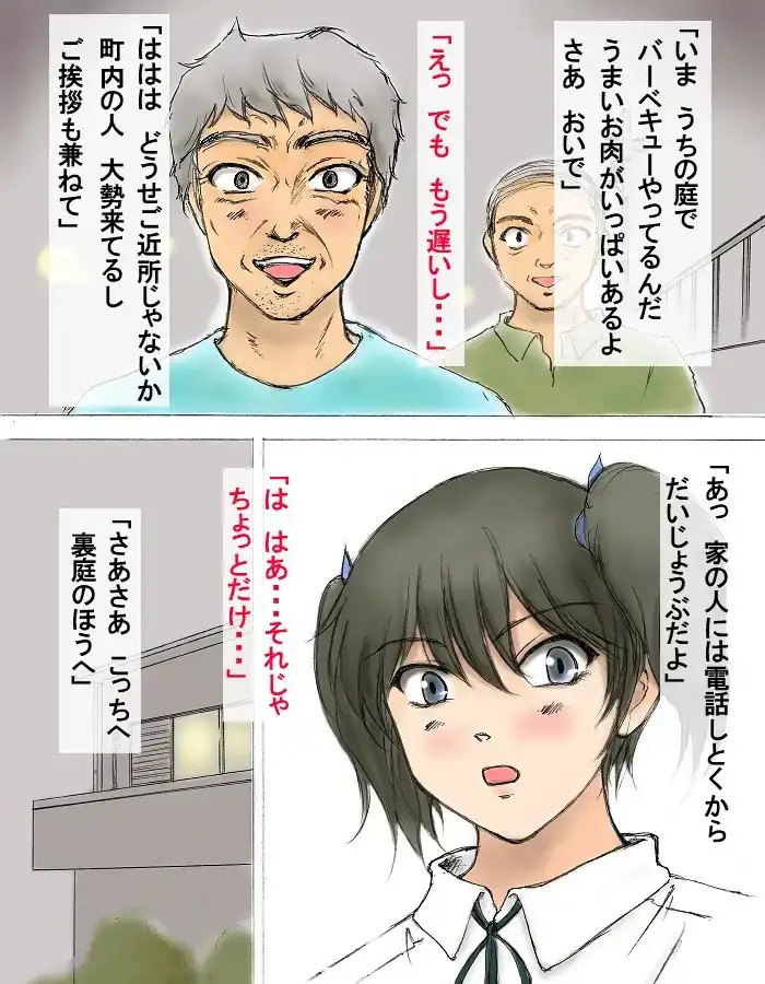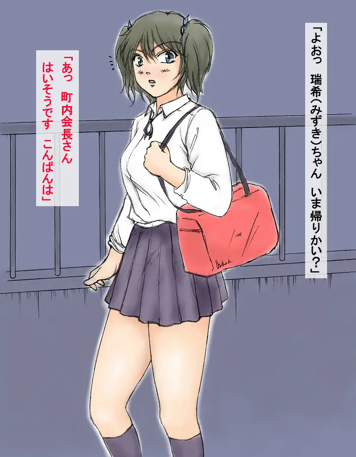 今回の話では町内会のおじさんたちが、主人公・椎野瑞希を騙して襲います。彼らは瑞希を輪姦したあげく、犬をつかった淫猥な責めで彼女を虐め抜きます。瑞希は恋人であるジョン(犬)のために必死で我慢するのですが、どうしても耐え切れず次第に屈服していきます。