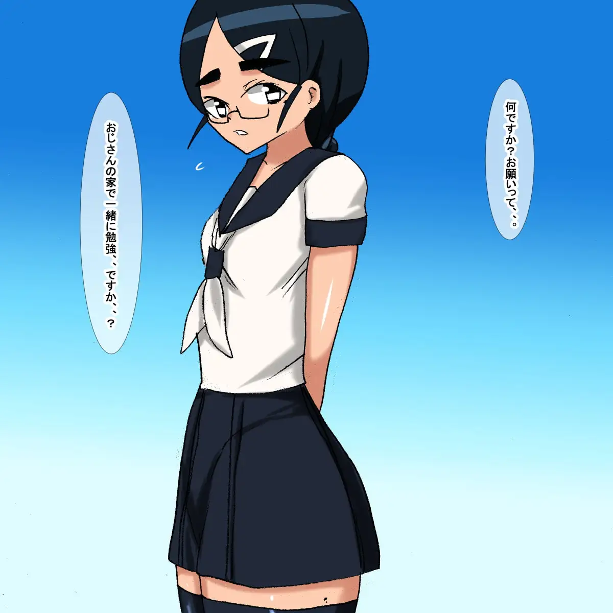 https://www.dlsite.com/maniax/circle/profile/=/maker_id/RG55477.html眼鏡をかけた地味な雰囲気の優等生学生が近所に住むおじさんとセックスする話のCG集です。