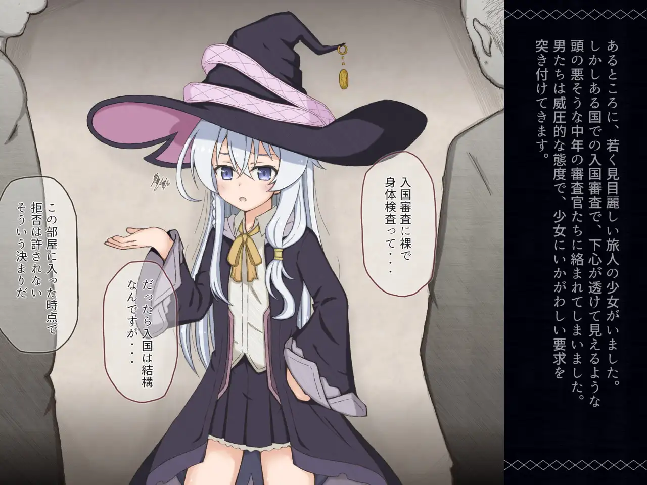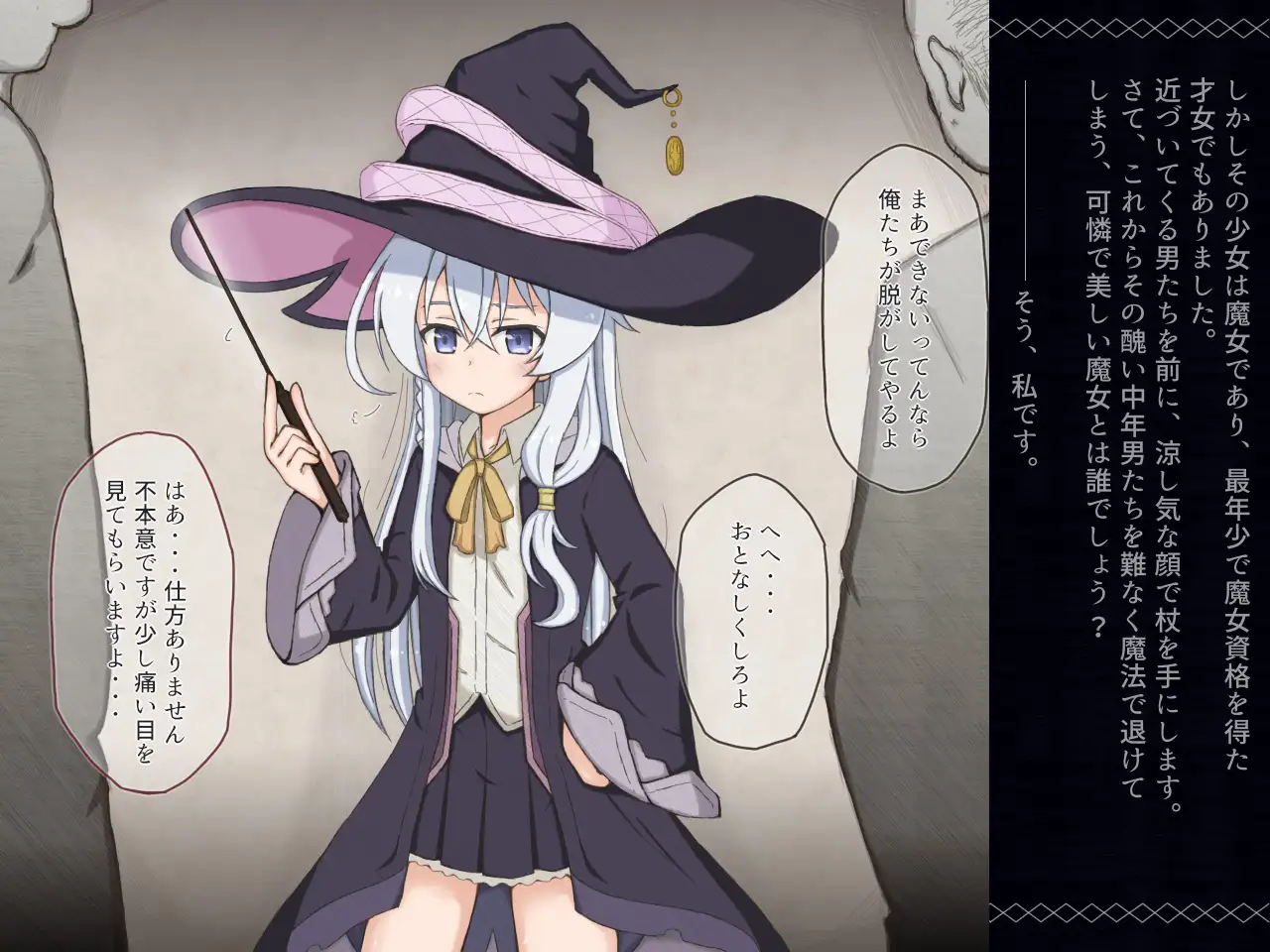若く見目麗しい旅の魔女が杖を奪われて魔法を封じられ、汚いおっさんたちにその体を陵辱されてしまう台詞付きCG集です。(25P・CG基本7枚、差分込み20枚)