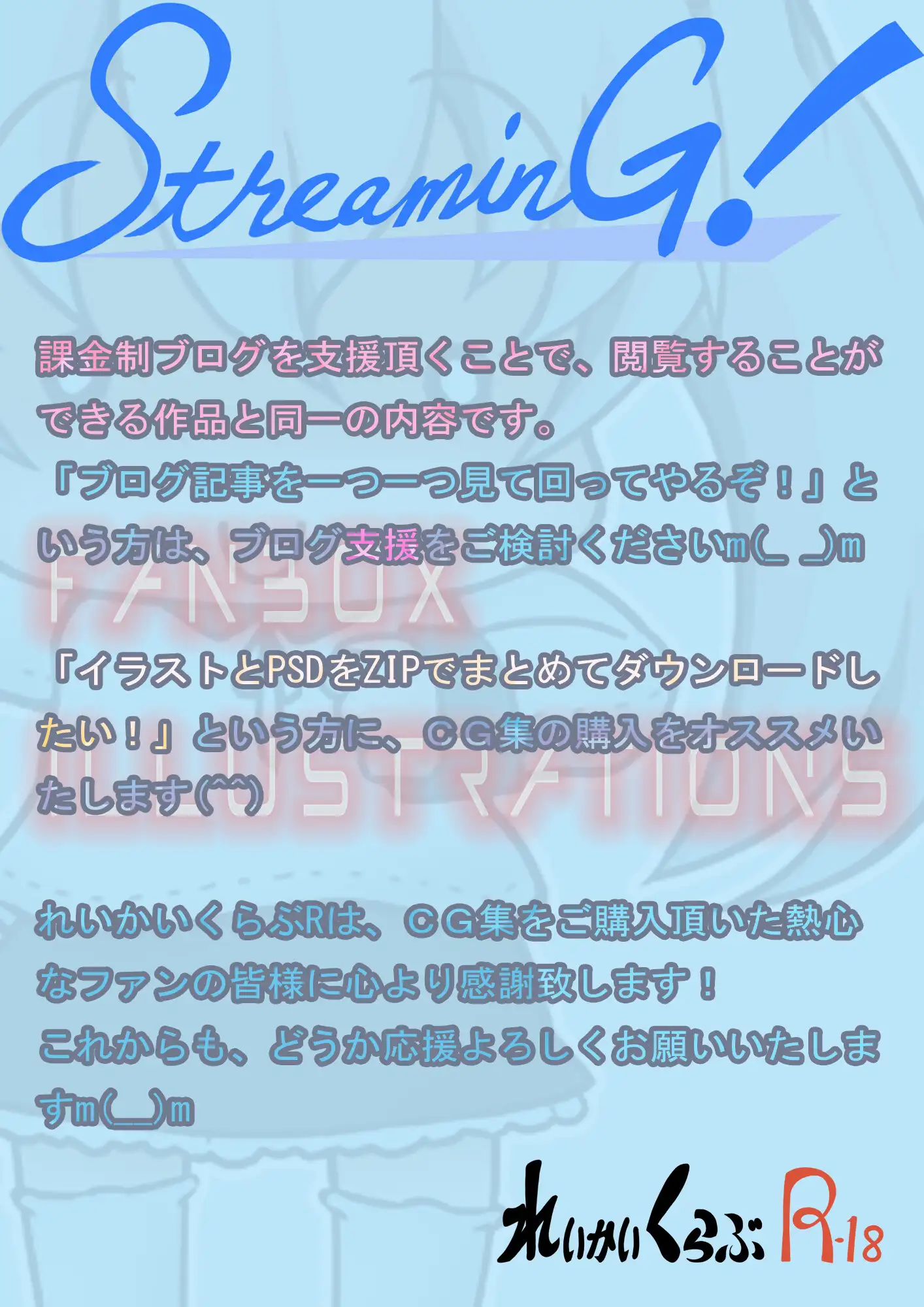 (6月のバックナンバー相当)れいかいくらぶRが、PIXIVFANBOXにて支援者限定で公開したイラストのバックナンバーZIPセットです。