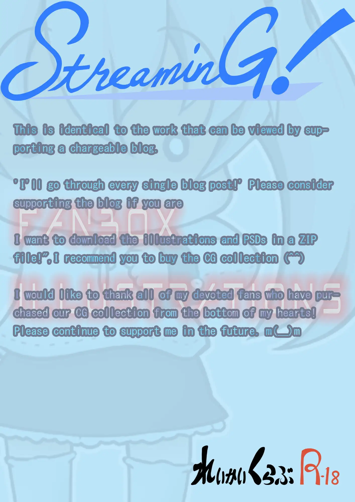とにかく、イラストとPSDファイルをまとめてZIPで欲しいという方はお買い求めください。『FANBOX ILLUSTRATIONS』は、課金制ブログの支援者限定作品と同一の内容です。