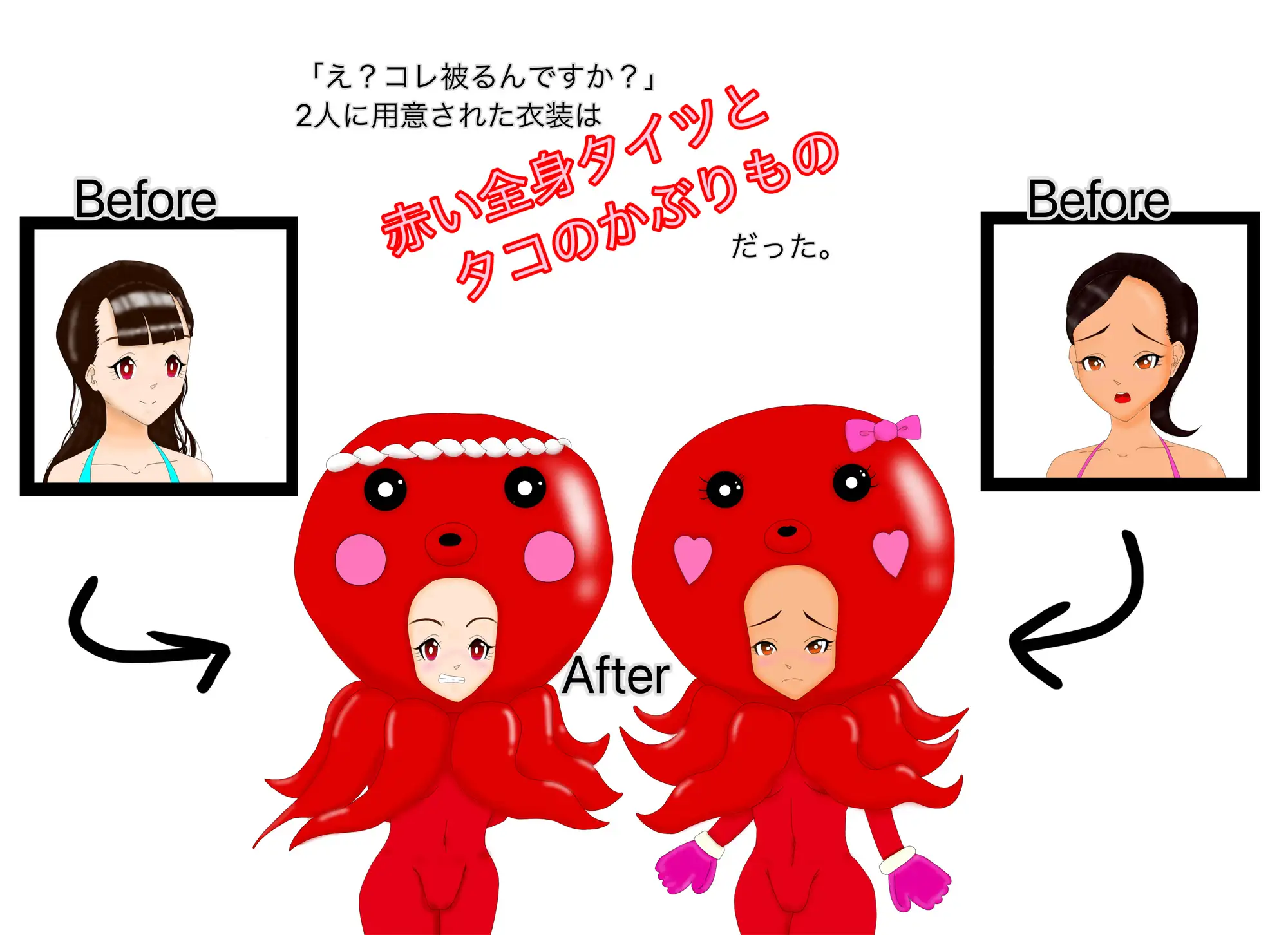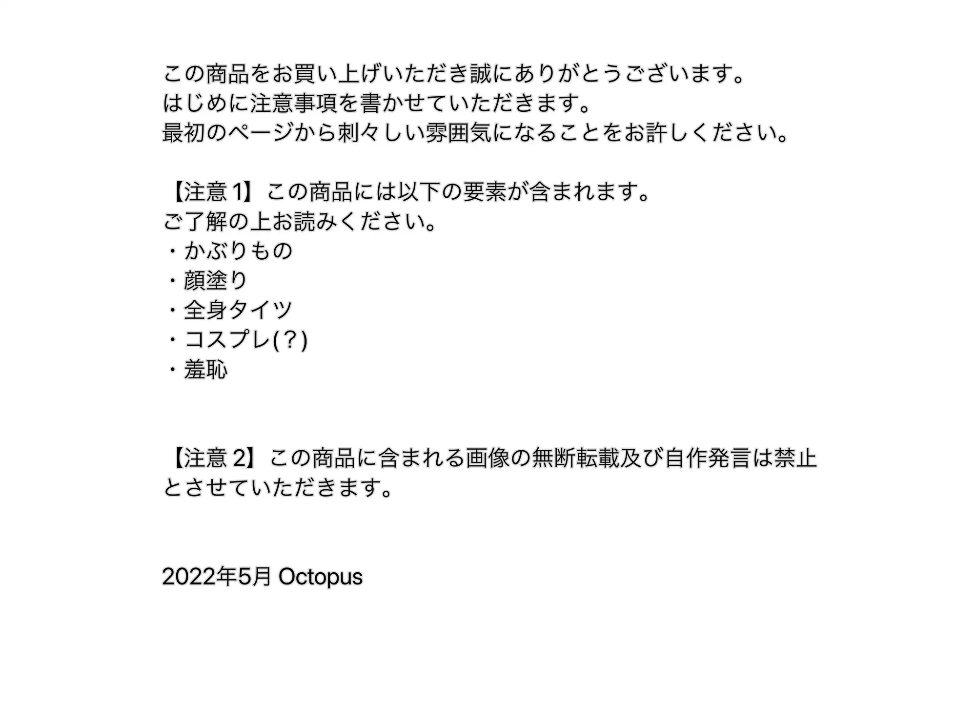 衣装がタコのかぶりものと全身タイツで羞恥を味わうことに!というお話です。 前回のイラスト集と違い明確にストーリーがあります。