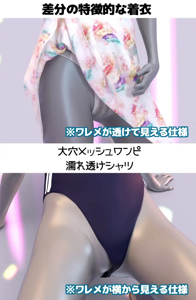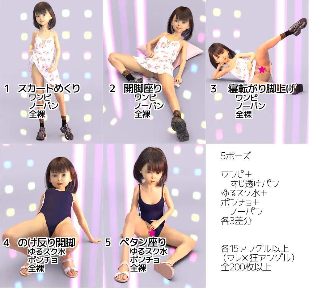 ポンチョノーパン・ゆるゆるスク水、3差分、2ポーズ。つるぷに微乳ということもあり、モデルの陰部もつるピカ一本線に改良しています。