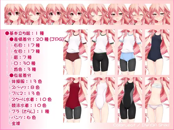 基本立ち絵1枚。表情&衣装差分特化型の着せ替えイラスト集です。