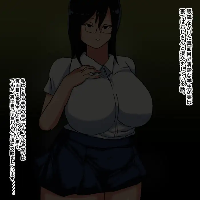 眼鏡をかけたクールで真面目なお嬢様優等生な女子●生が裏ではおじさんと援交をしている話のCG集です。