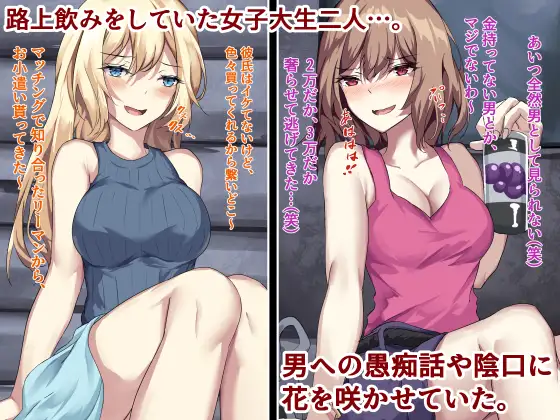 路上で深夜まで飲んでいた女子大生二人。飲みすぎてしまい、帰り道で男達に捕まってしまう。