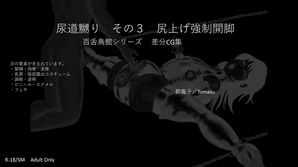 百舌鳥館で働くマゾ・裏アイドル、レイナが、ラバースーツで緊縛・拘束され強制開脚のまま、ビニール・ダイパーを履かされたり、尿道ピアス・ブジーをされ、尿道に指を挿入される差分痴態CG集です。乳房も根本が縛られ乳首も苺のように括れています。