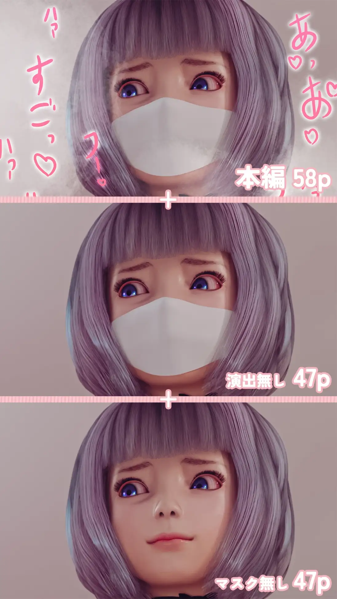 セリフ・演出ありの本編(58枚)、おまけデータ2種類(47枚ずつ)のパッケージです