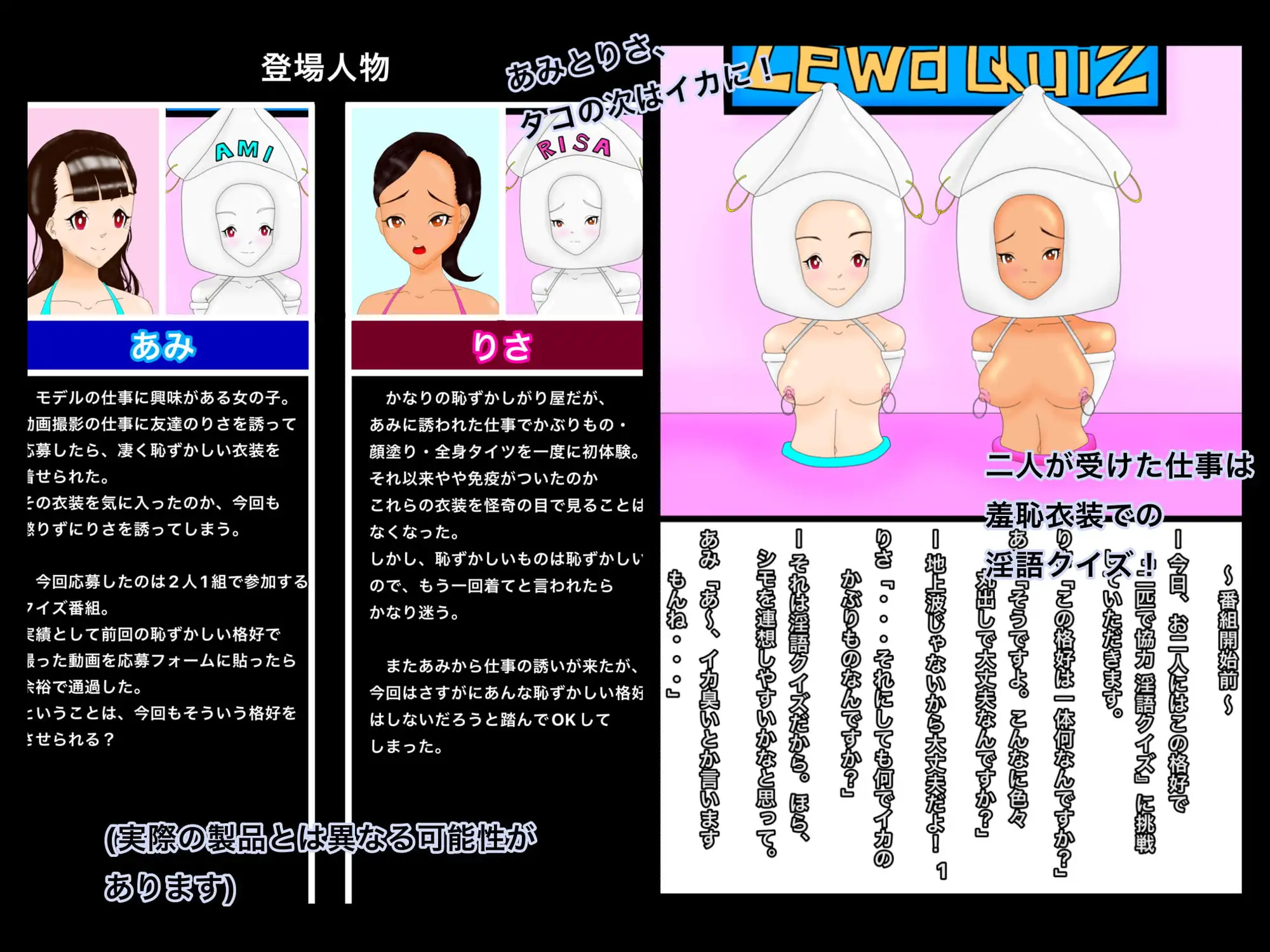 ペアでクイズ番組に出演という仕事内容のため、友達のりさを誘って正式に出演を承諾した。しかし、そのクイズ番組は羞恥エロ衣装で淫語クイズをするものだった。