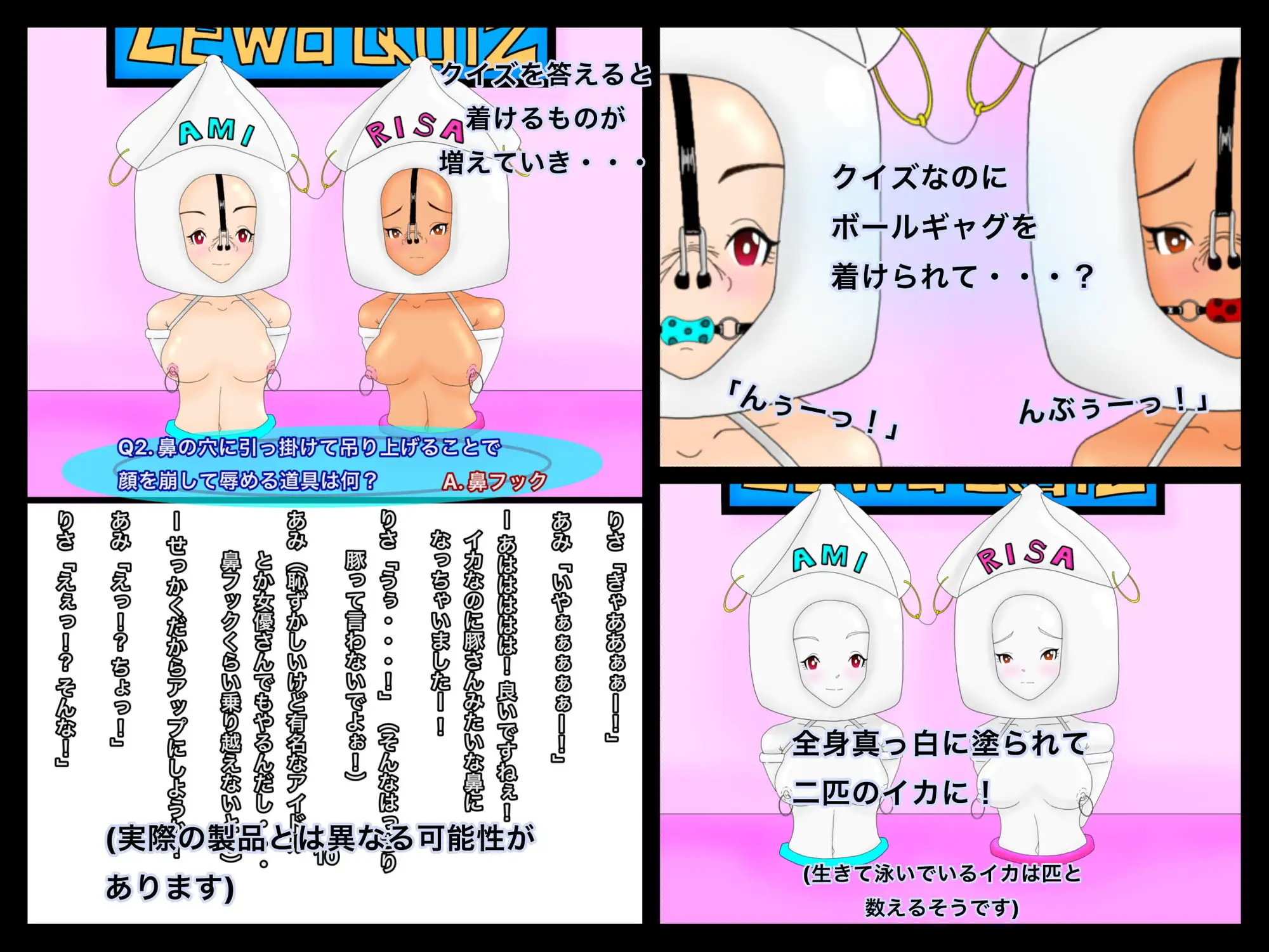 更にはイカのかぶりものまで被されてしまい、恥ずかしさに悶える。クイズに答えるうちにその異常さには慣れてくるが、鼻フックやボールギャグなど次々と二人を辱めるものが追加されていき…