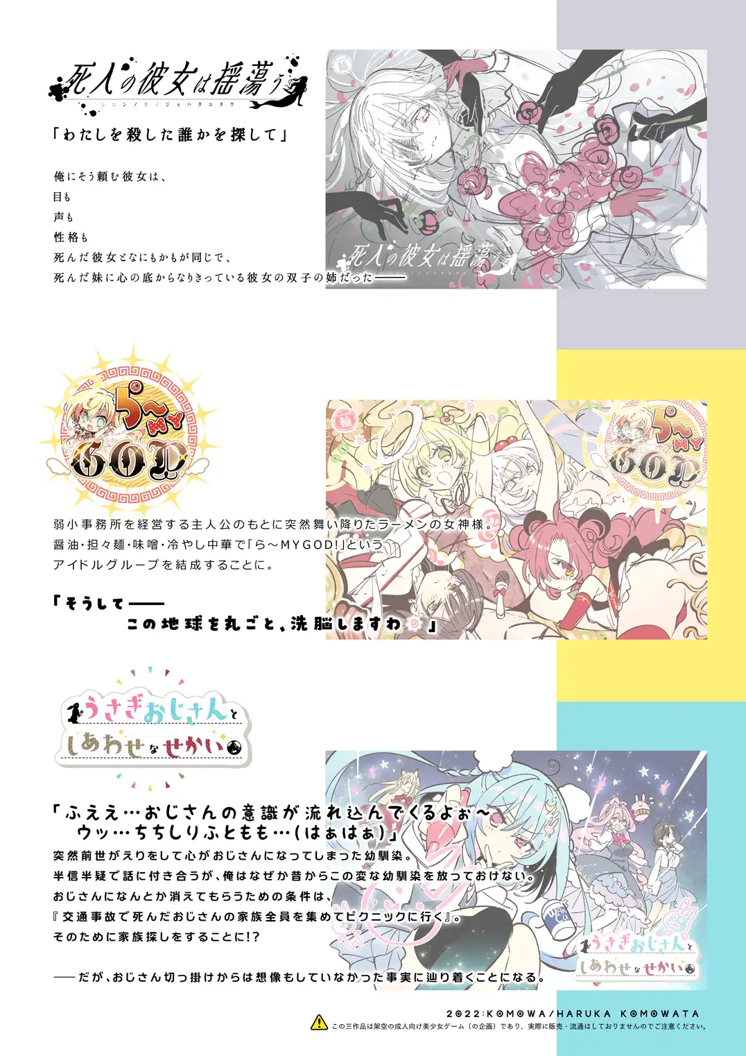 キャラクタの名前がある。キャラクタの設定がある。キャラクタのカラーイラストがある。作品あらすじがある。作品ジャンルがある。作品ロゴがある。でも、ゲーム本編がない。なので架空。今作では3本の企画(+α)と盛り沢山。1作品に複数キャラクタが当然います。エロゲですからね。でも架空ですけどね!ややこしいな!?架空、なのにここまでのクオリティ。まさに神々の遊び。作品が実際に生まれる可能性は、否定しません。むしろ頼む。