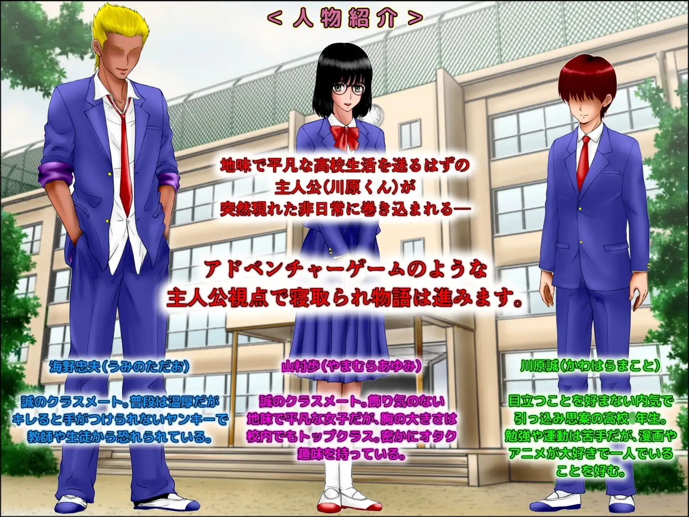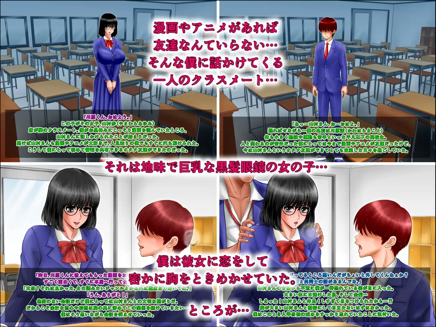漫画やアニメがあれば友達なんていらない…そう思っていた僕(川原誠)になんとオタク友達(山村歩)ができてしまった。それは地味で巨乳な黒髪眼鏡の女の子…僕はたちまち心を惹かれ、毎日楽しい学校生活を送っていた。ところがそんなある日、クラスの金髪ヤンキー(海野忠夫)に声をかけられ…僕は地獄の底へ突き落とされることになる─!【ページ構成】