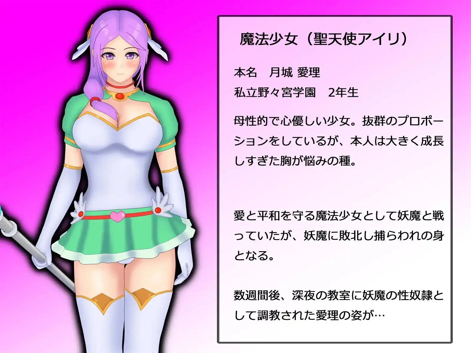 母性的で心優しい魔法少女「月城 愛理」は妖魔に敗北し囚われの身となってしまう。数週間後 深夜の教室に性奴隷として調教された愛理の姿が…