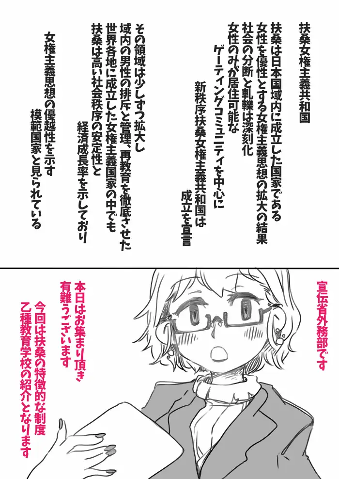 このページでは、未成年者閲覧禁止の同人作品、『女権国家扶桑乙種教育について』を紹介しています。ネタバレ注意。